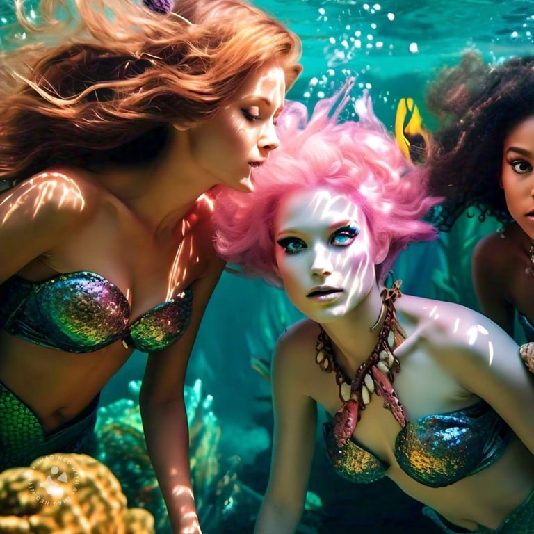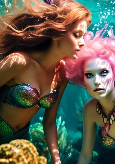 Eye-catching image or animation of mermaids/merfolk in vibrant, colorful underwater scenes.