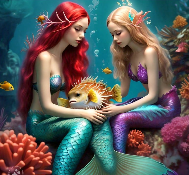Image Idea: A colorful coral reef with playful baby mermaids and sea creatures.