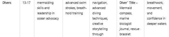 Students can start at any level based on age, ability, and comfort in the water. Each program is designed to stand alone, meaning newcomers wonβt feel like theyβve missed out, while those who progress through all levels will develop a full spectrum of mermaiding and oceanic skills.