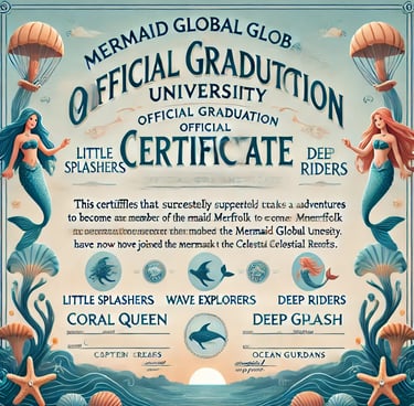 "Presented to merfolk who have shown courage, unity, and unyielding curiosity in navigating the seas of discovery, harmonizing with the rhythms of the ocean to excel in creativity, knowledge, and connection. Granted under the authority of the Elders of the Sapphire Depths, this document honors their transformation and welcomes them into the ranks of Mermaid Global University, where they are recognized as merfolk, ready to one day explore the wonders of Merworld."